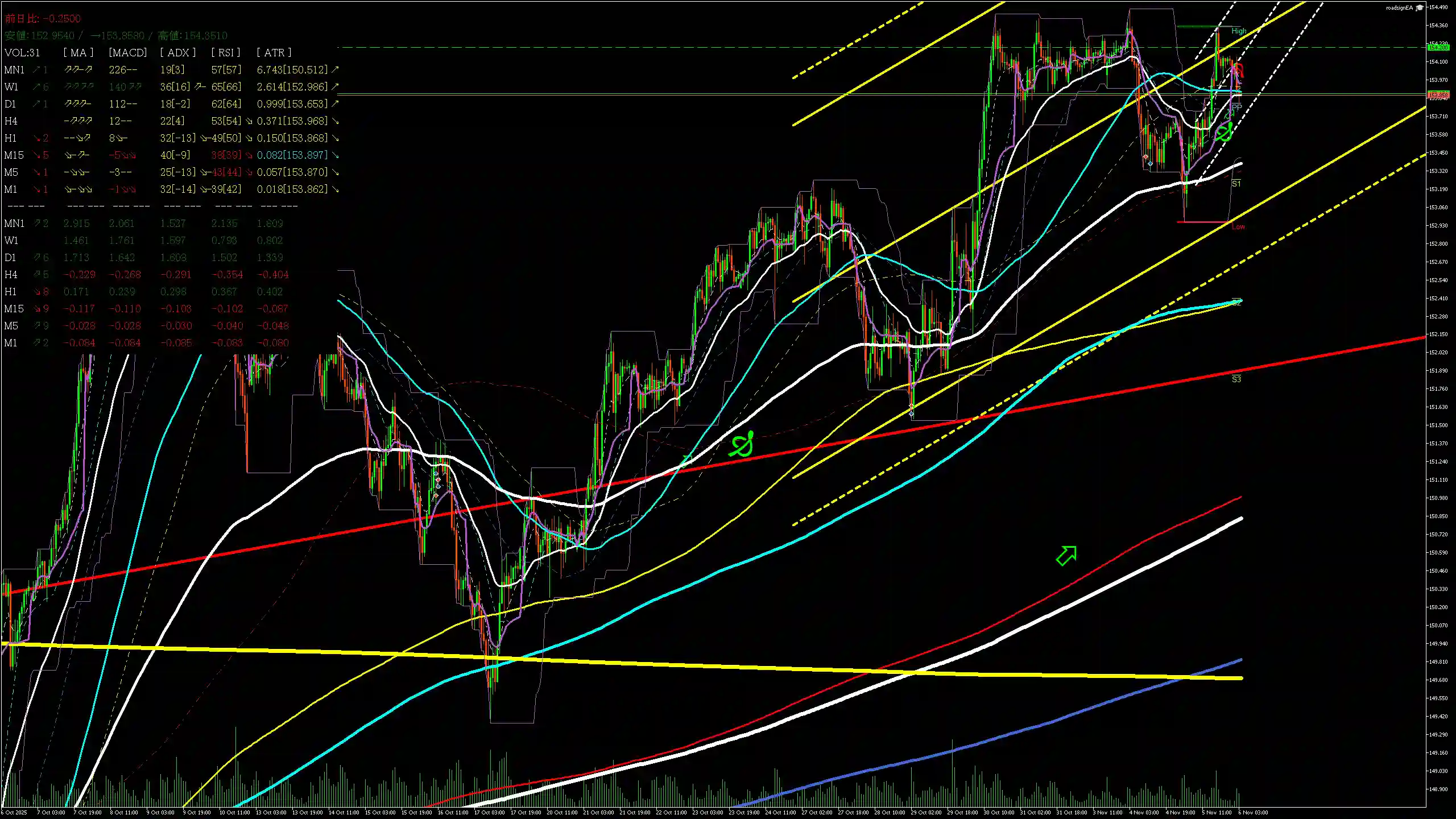 - 7〜8月以降の下落トレンドから完全に脱却し、H1〜MN1すべてで上昇トレンド。