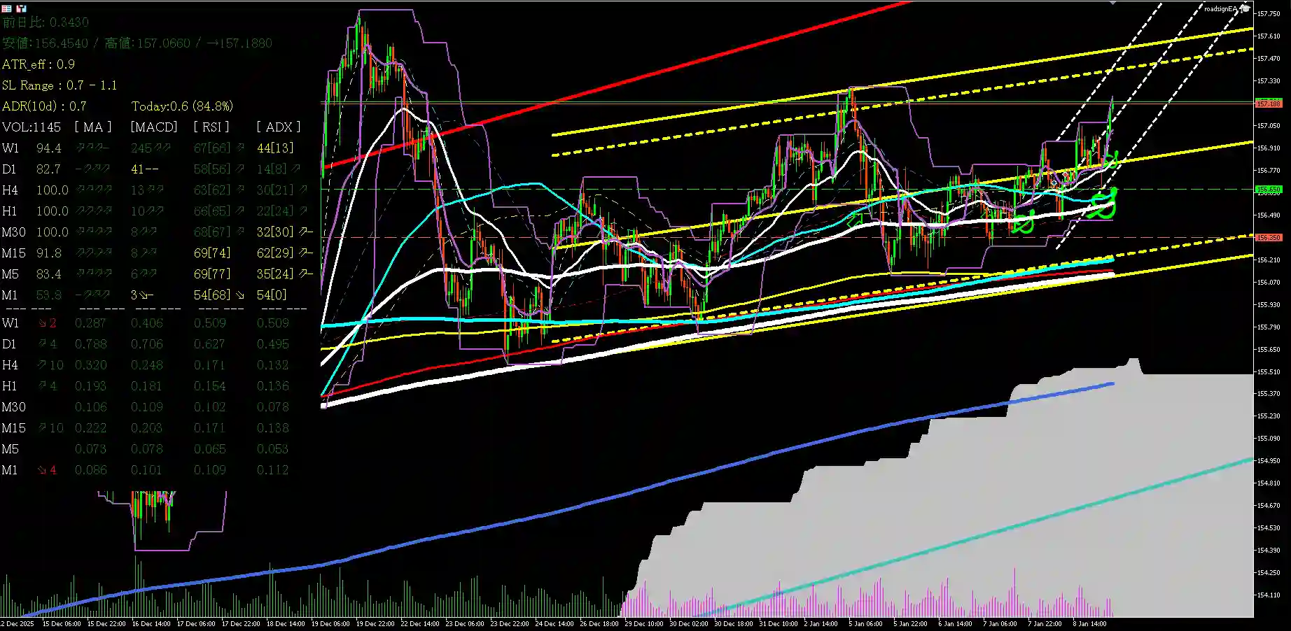 | 動的POC (Point of Control) | 市場合意価格。 直近20本で最も出来高が集中した価格点。 | 最強のレジサポとして機能。ここを突破するには強いボリュムスパイクを必須条件とする。 |