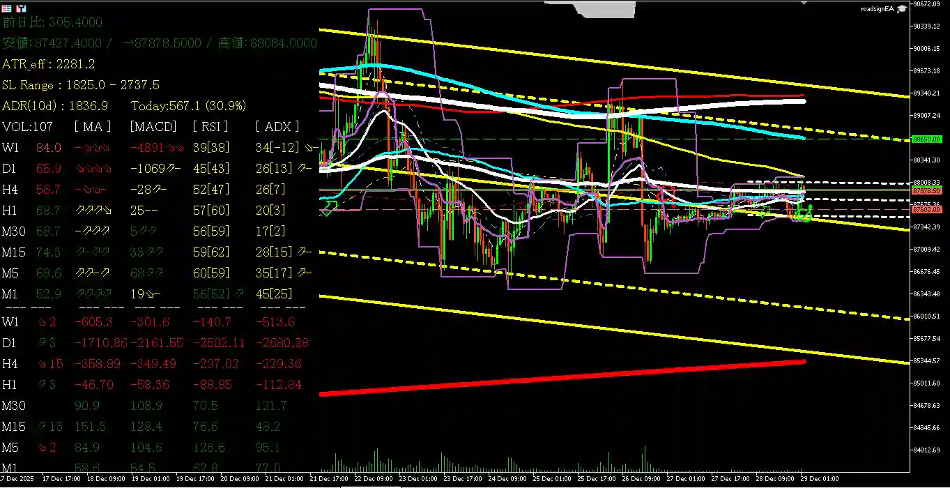 - H4/H1: 構造破壊(BOS)完了。 $\$88,000$を実体で割り込み、下降チャネルを形成中。
