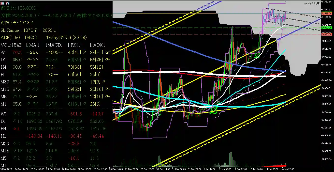 • Entry: 90,900〜91,000 押し目買い(ATR下限付近)