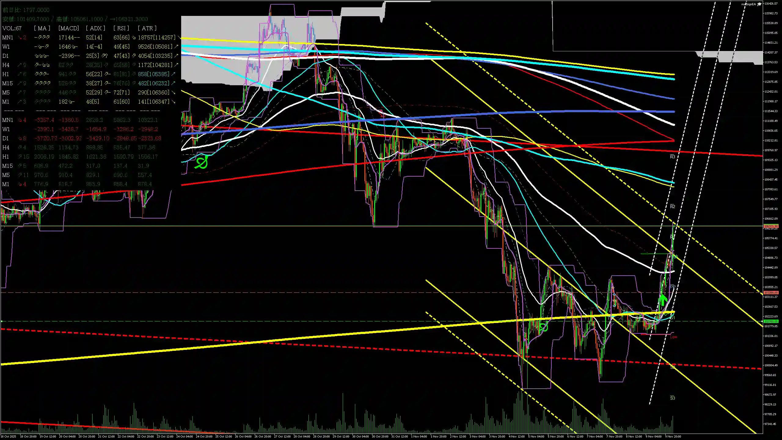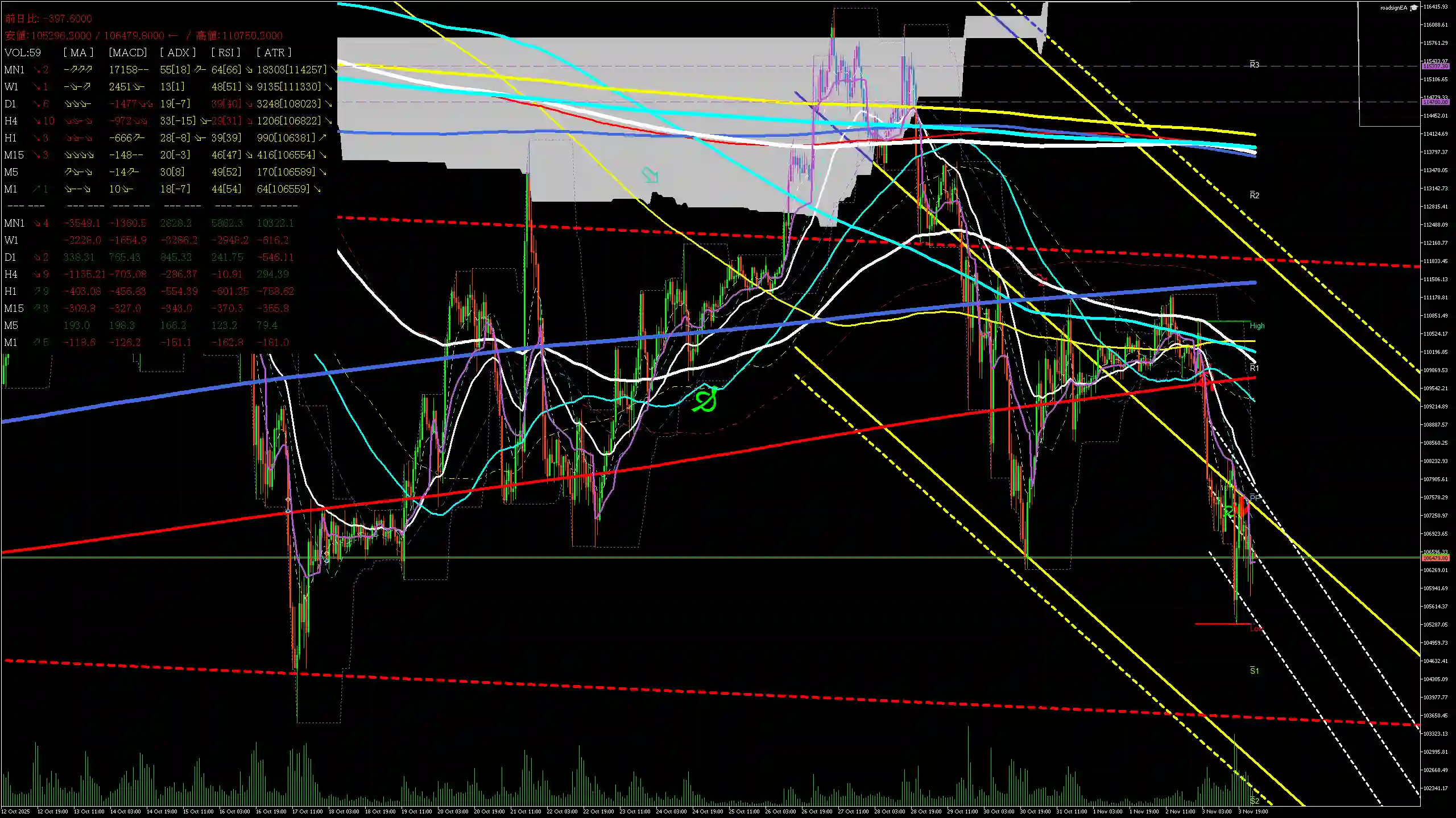 - D1/W1/MN1 いずれも MA200上、MN1 RSI 74/ADX 53で上昇構造明確。価格調整は押し目の範疇。