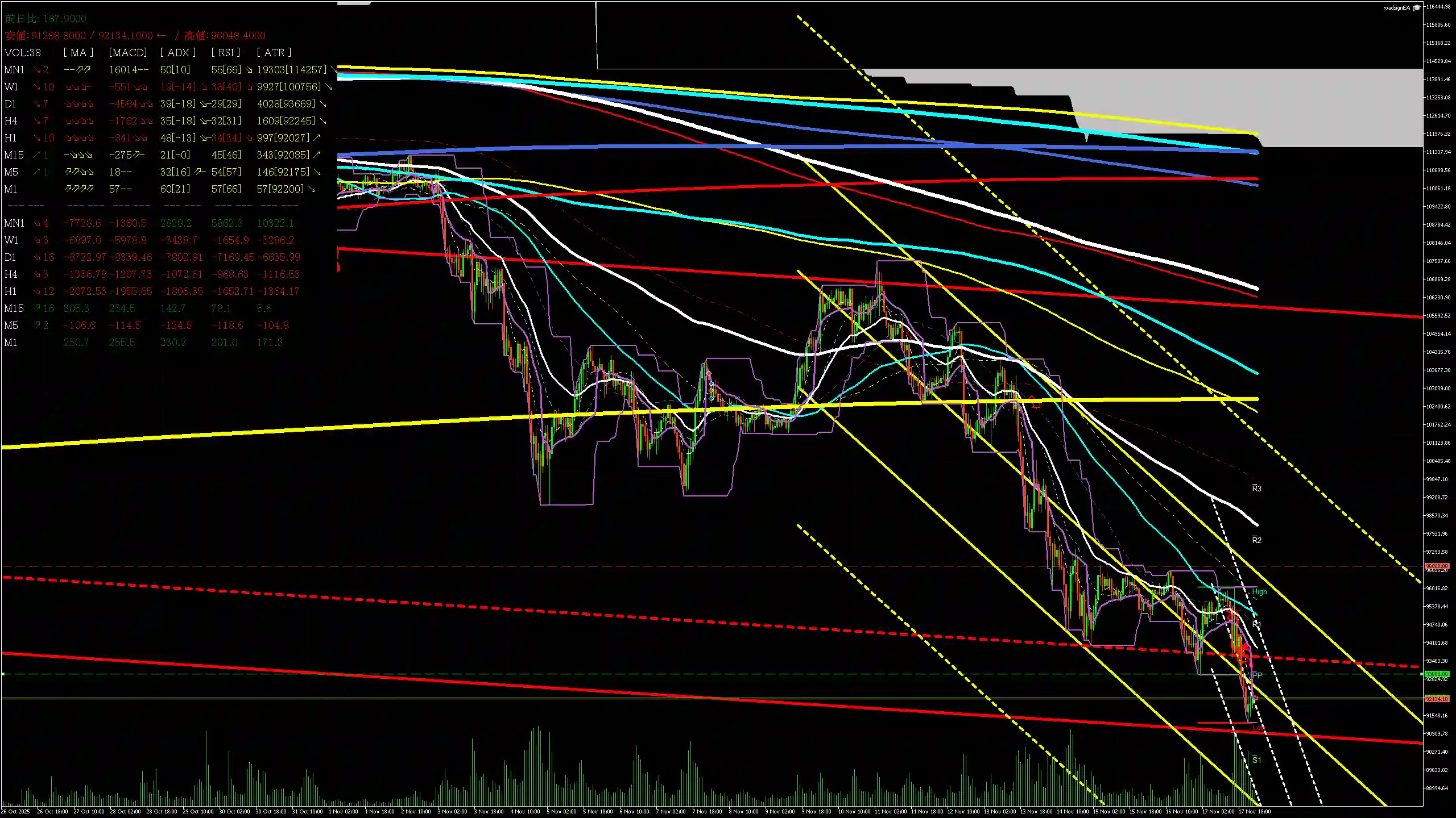 BTCUSDは短期下降(確信度61.8%)ながら、中期上昇(確信度87.0%)を維持。